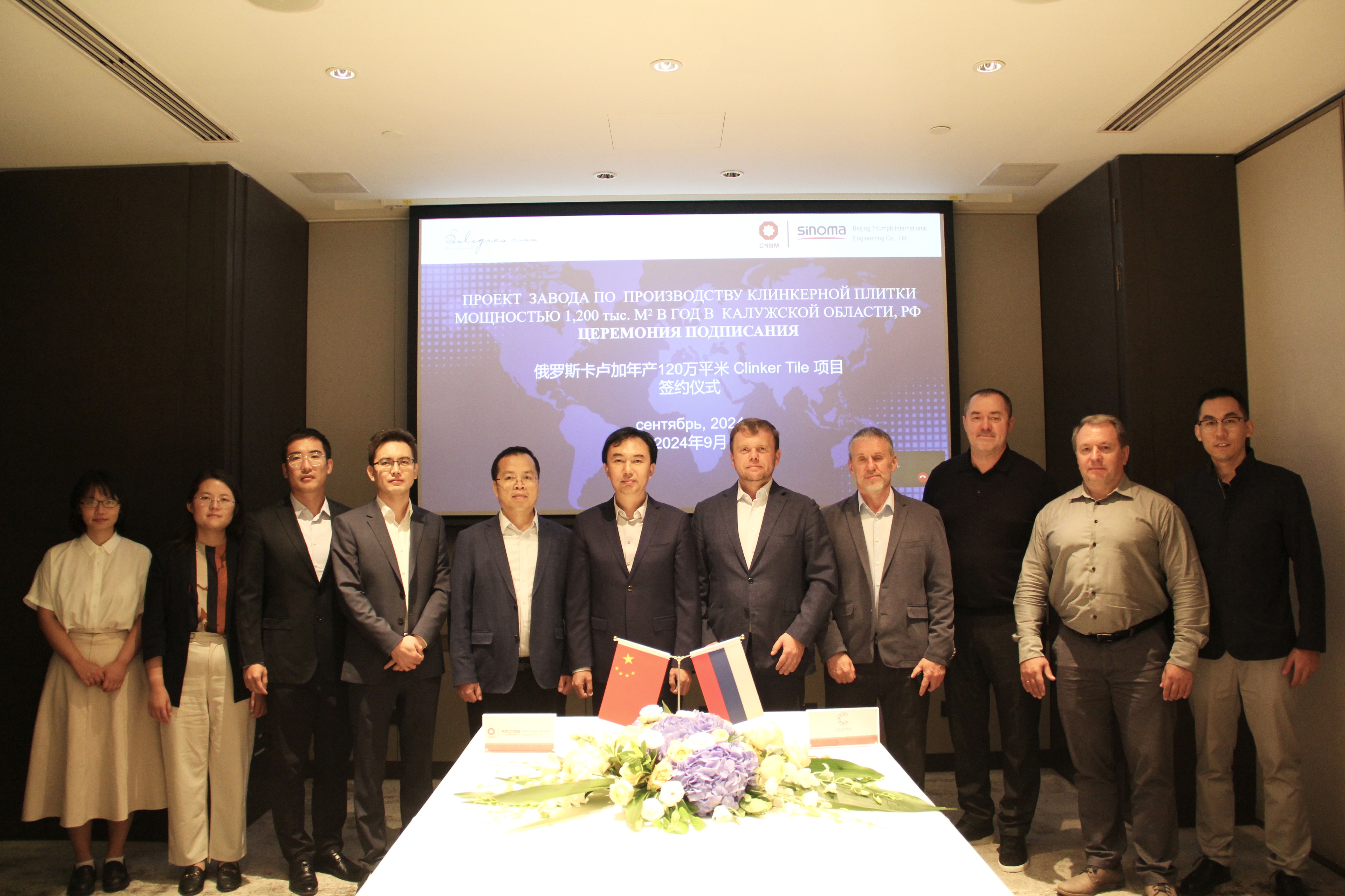 Tochka Center集團項目總監Sergei Shumilin,Sologres公司董事Maksim Baidakov,北京凱盛總經(jīng)理謝吉優(yōu)、副總經(jīng)理曹玉波、水泥項目設計經(jīng)理王巖、陶板項目設計經(jīng)理馬雷、市場(chǎng)經(jīng)理李梓冰、商務(wù)專(zhuān)員黎瑞祺,北京凱盛俄羅斯公司高級顧問(wèn)Maxim Stroganov參加簽約儀式。