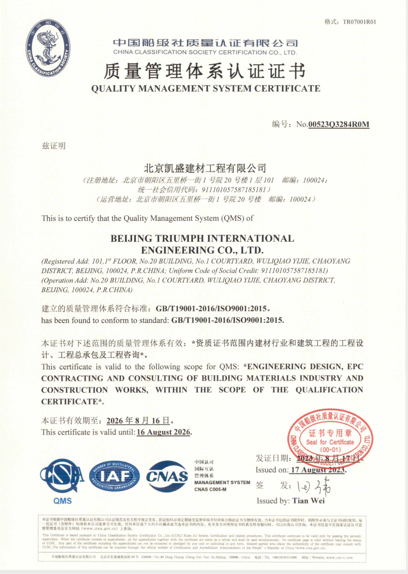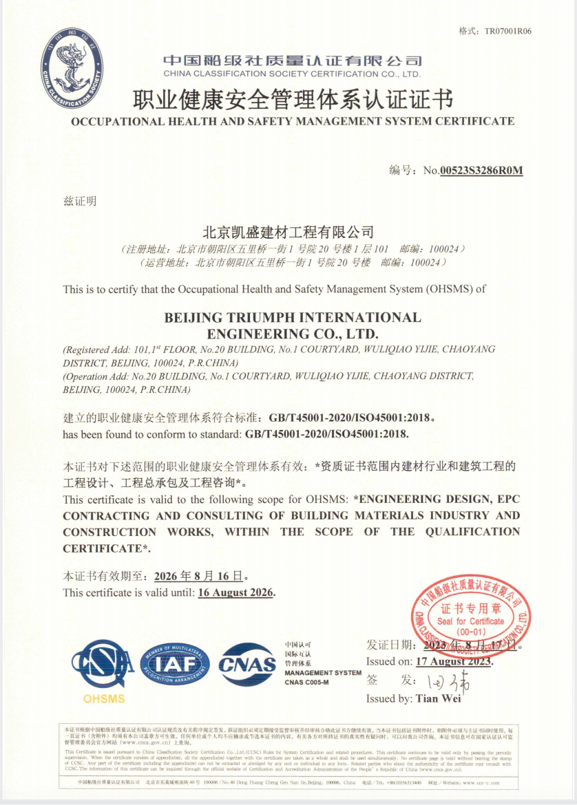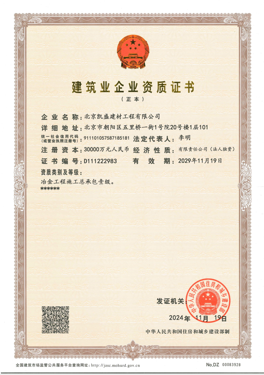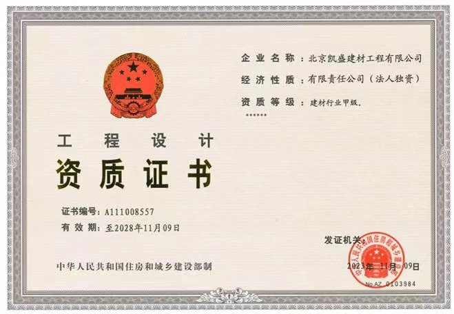 北京凱盛擁有國家建材行業(yè)工程咨詢(xún)甲級資信證書(shū)、建材行業(yè)甲級工程設計資質(zhì)證書(shū)、冶金工程施工總承包一級資質(zhì)證書(shū),是國家級高新技術(shù)企業(yè)。