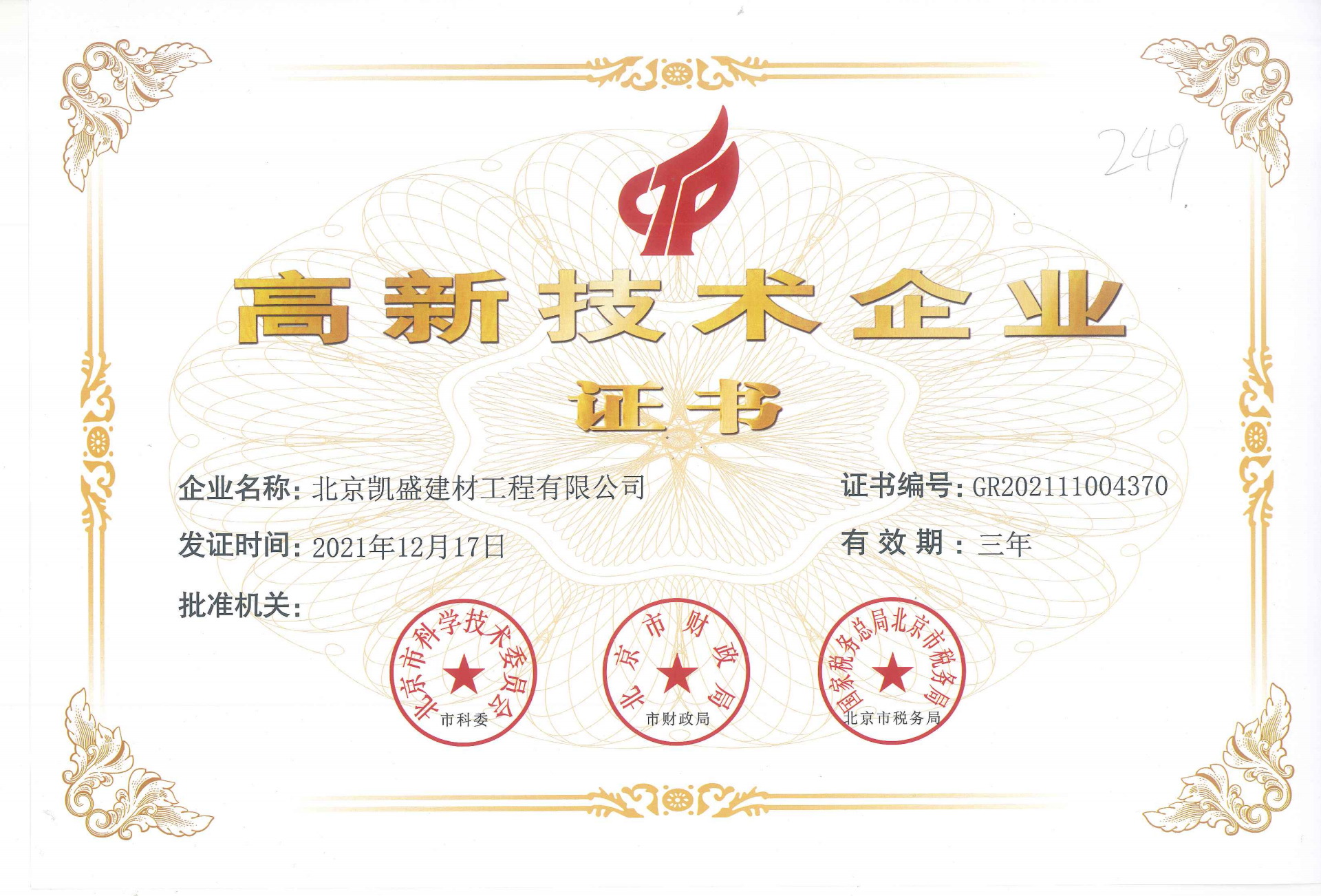 高新技術(shù)企業(yè)證書(shū)